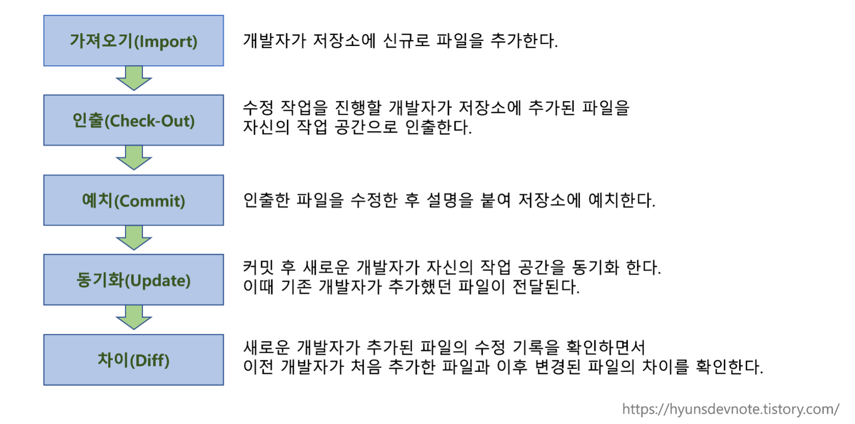 ▸ add : 새로운 파일이나 디렉터리를 버전 관리 대상으로 등록 ▸ commit : 버전 관리 대상으로 등록된 클라이언트의 소스 파일을 서버의 소스 파일에 적용 ▸ update : 서버의 최신 commit 이력을 클라이언트의 소스 파일에 적용 ▸ checkout : 버전 관리 정보와 소스 파일을 서버에서 클라이언트로 받아옴 ▸ lock/unlock : 서버의 소스 파일이나 디렉터리를 잠그거나 해제 ▸ Import : 아무것도 없는 서버의 저장소에 맨 처음 소스 파일을 저장 ▸ export : 버전 관리에 대한 정보를 제외한 순수한 소스 파일만을 서버에서 받아 옴 ▸ info : 지정된 파일에 대한 정보 표시 ▸ diff : 지정된 파일이나 경로에 대해 전 리비전과의 차이 표시 ▸ merge : 다른 디렉터리에서 작업된 버전 관리 내역을 기본 개발 작업과 병합 |
