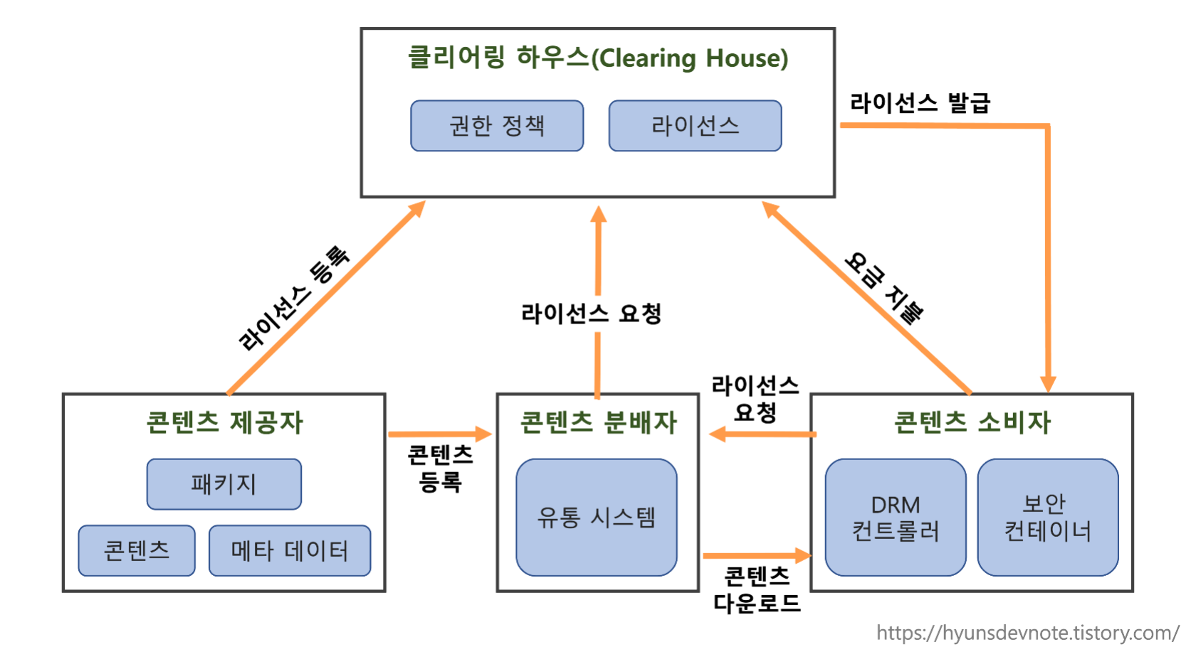① 클리어링 하우스(Clearing House) : 저작권에 대한 사용 권한, 라이선스 발급, 사용량에 따른 결제 관리 등을 수행하는 곳