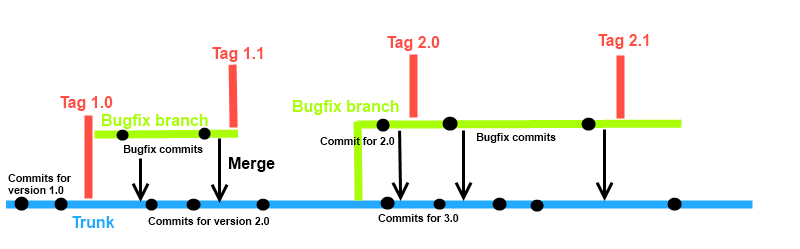 모든 개발 작업은(trunk{몸통,줄기: 가장 중심이 되는 메인 디렉토리} )에서 수행되며 추가 작업은 branches(서브 디렉토리 ) 안에 별도의 디렉토리를 생성해 작업한 후 trunk 디렉터리와 병합한다.