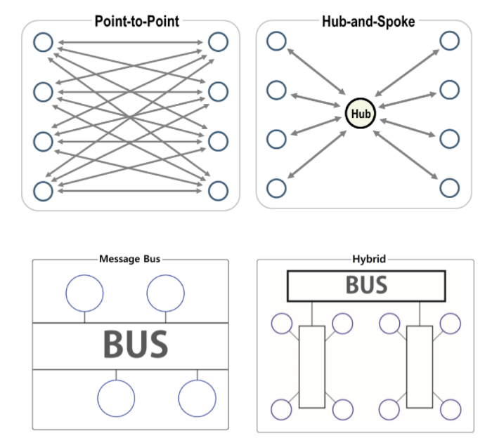 EAI는 기업 내 각종 애플리케이션 및 플랫폼 간의 정보 전달, 연계 통합 등 상호 연동이 가능하게 해주는 솔루션이다. EAI는 비즈니스 간 통합 및 연계성을 증대시켜 효율성 및 각 시스템 간의 확정성을 높여준다. EAI의 구축 유형은 다음과 같다.