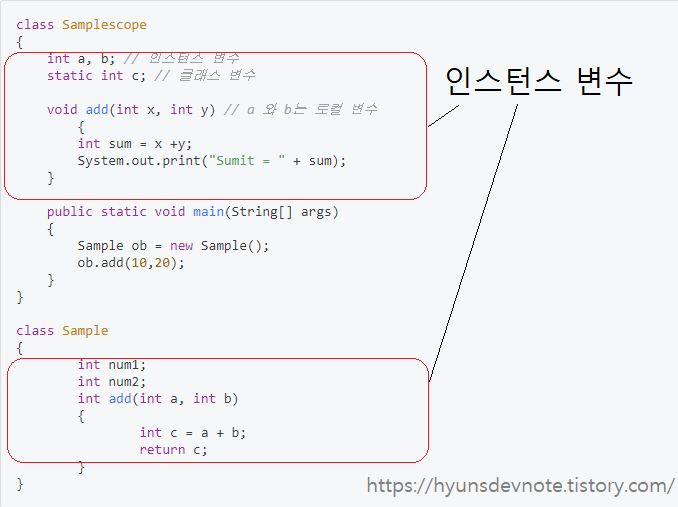 | 클래스 변수 | 인스턴스 변수 |