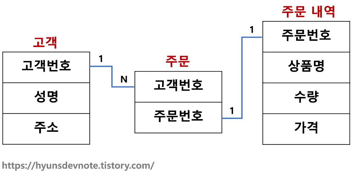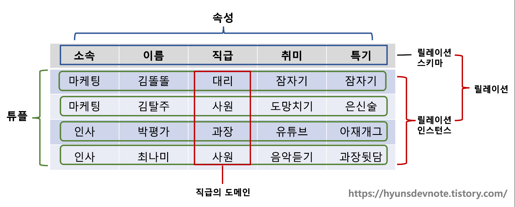 ◍ 관계(Relationship): 개체 간의 관계 또는 속성 간의 논리적인 연결을 의미한다.